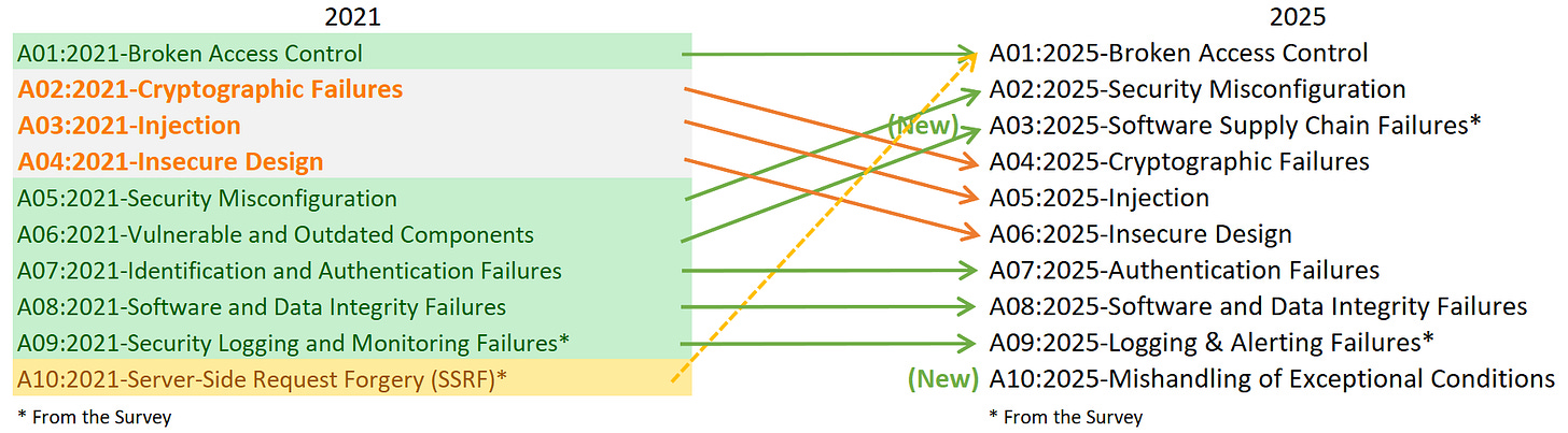 The OWASP1 Top 10 list for 2025 has been released, four years after its previous iteration. The list is a general assessment of significant risks in web application security. Its structure and changes from the 2021 list offer insight into the state of the industry, highlighting areas where we are improving and, more often, where we continue to fail. These are my brief thoughts on the list in general.